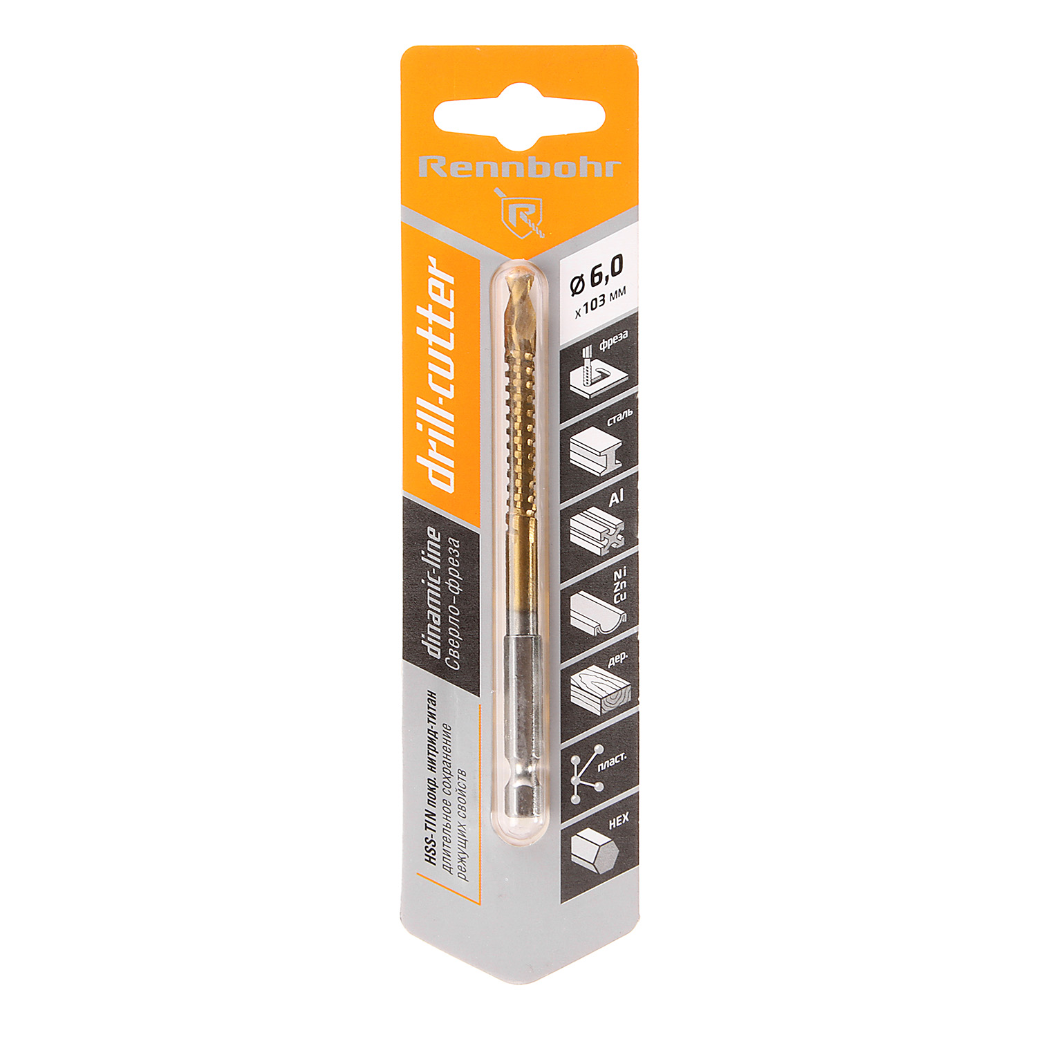 Сверло-фреза 6х103мм HSS-TIN хвостовик HEX1/4"Е6,3 (672206) Drill-cutter Rennbohr *1/400