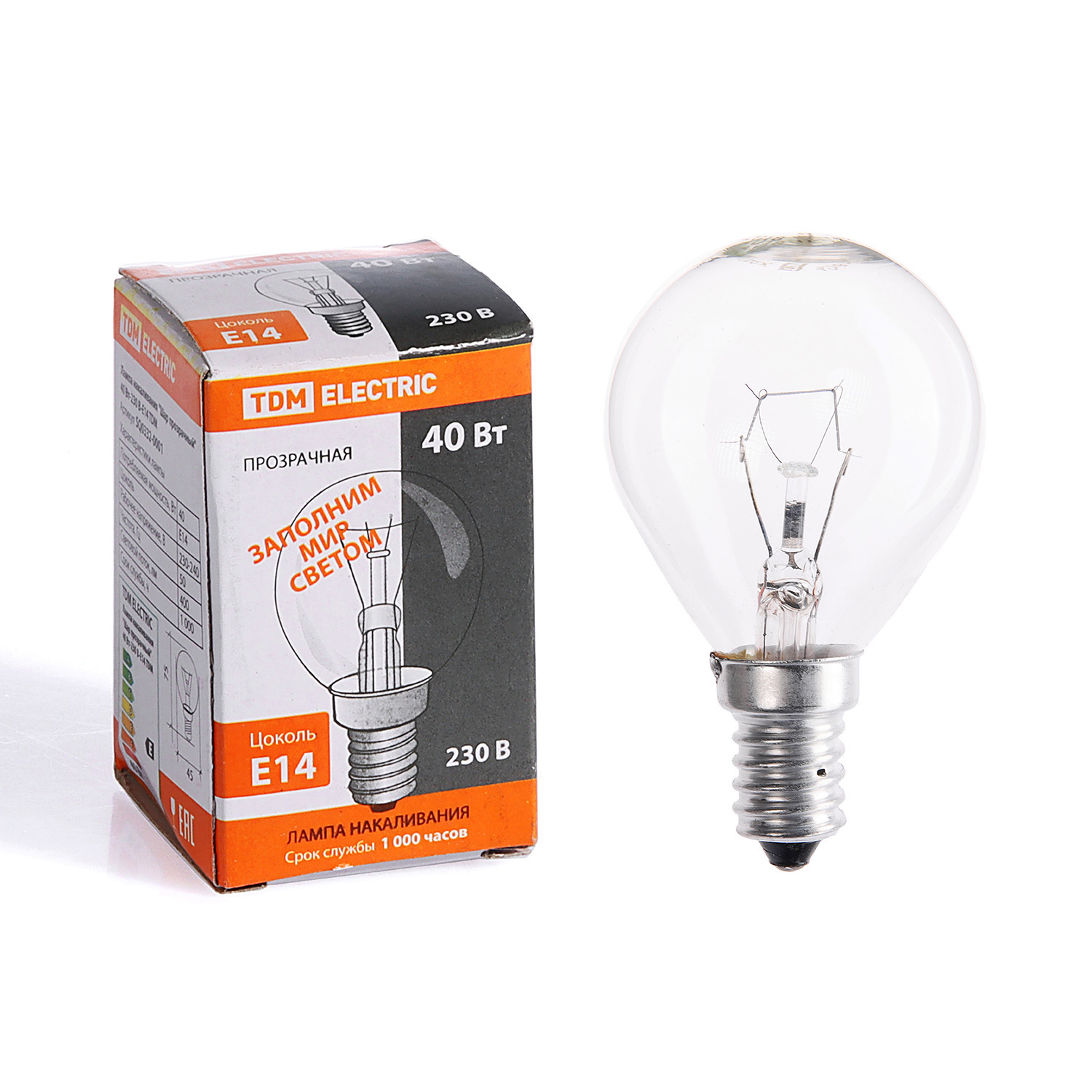 Лампа накаливания TDM, Е14, шар, 40 Вт, 400 Лм, теплый белый свет