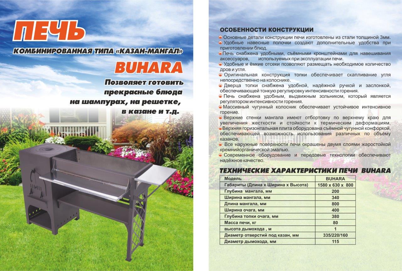 Печь «казан-мангал» предназначена для приготовления пищи на углях с использованием шампуров, решеток, вертела и других приспособлений, а также приготовления различных блюд в казане, на пламени горящих дров.
