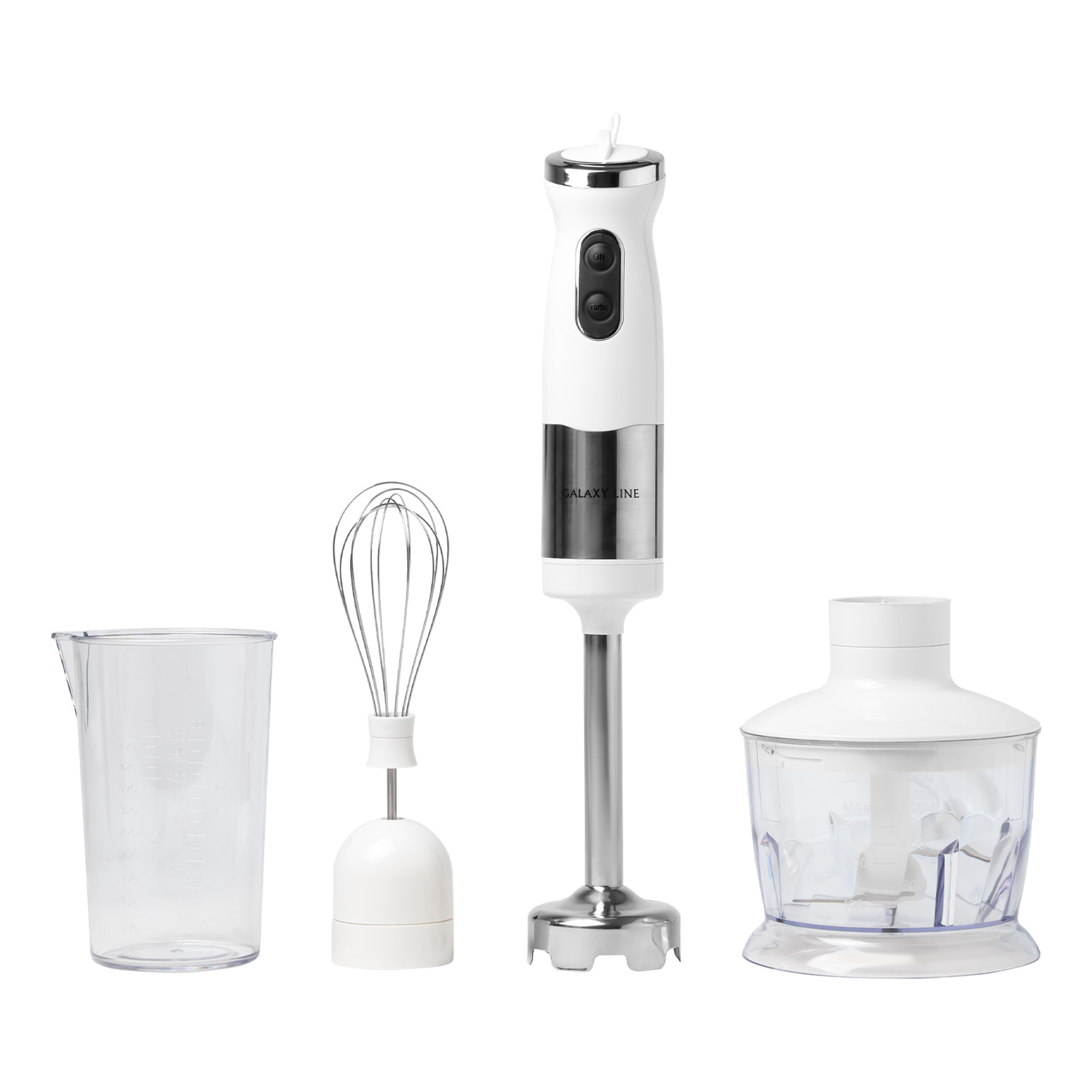 Блендерный набор GALAXY LINE GL2121 предназначен для взбивания, измельчения и сме­шивания ингредиентов. Набор включает несколько насадок и предметов: измельчитель (чоппер), погружной блендер, венчик, мерный стакан. Насадка-измельчитель с пластиковой чашей объемом 0.5 литра позволит Вам быстро измельчить овощи для салата или супа, превратить мясо или рыбу в фарш, приготовить паштет и многое другое. Погружной блендер из высококачественной нержавеющей стали имеет четырехлопастный нож, который долго держит заточку и быстро измельчает даже горячие и твердые продукты.