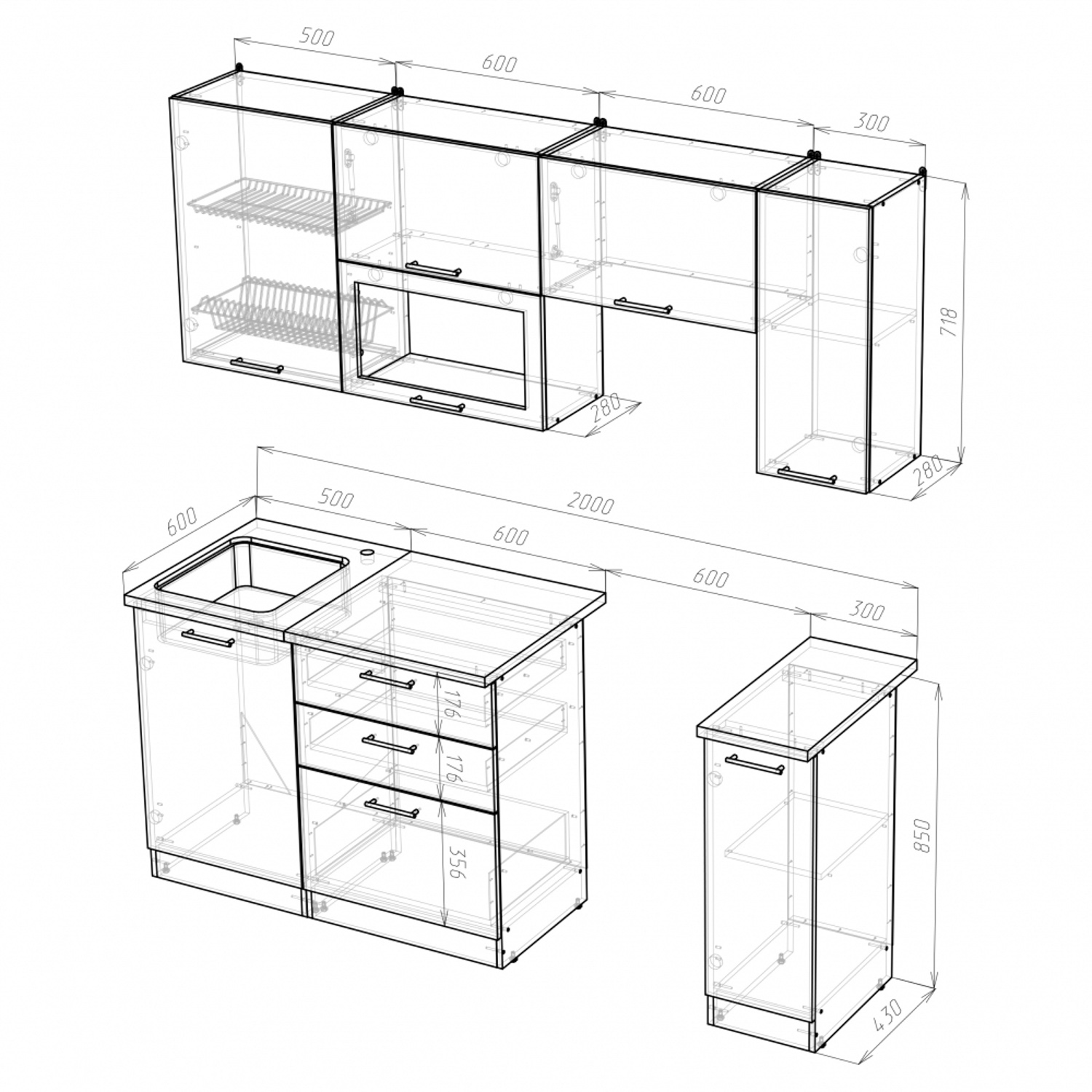 *мойки, смесители и посудосушители в комплекты гарнитуров не входят.