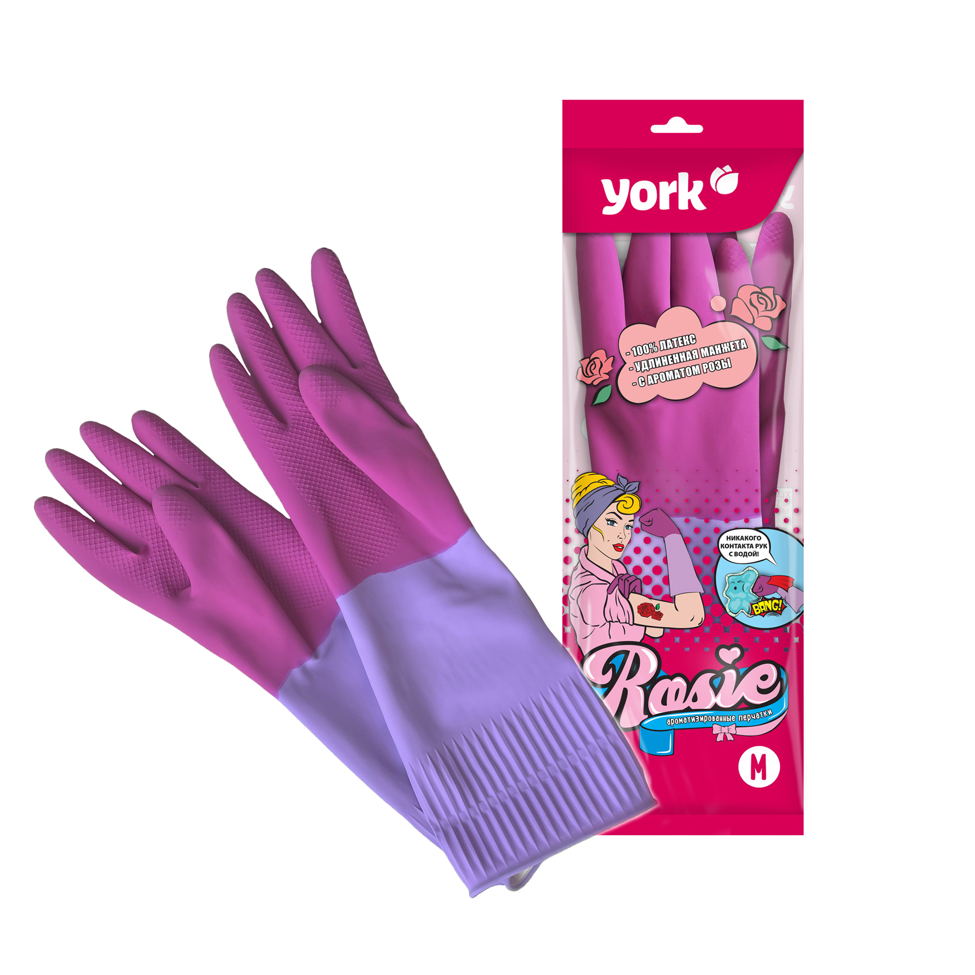 Перчатки латексные с хлопк.напыл. прочные Удлинненные Роз./Сир. 1пара р-р  "M" 092670 "York"*12/48