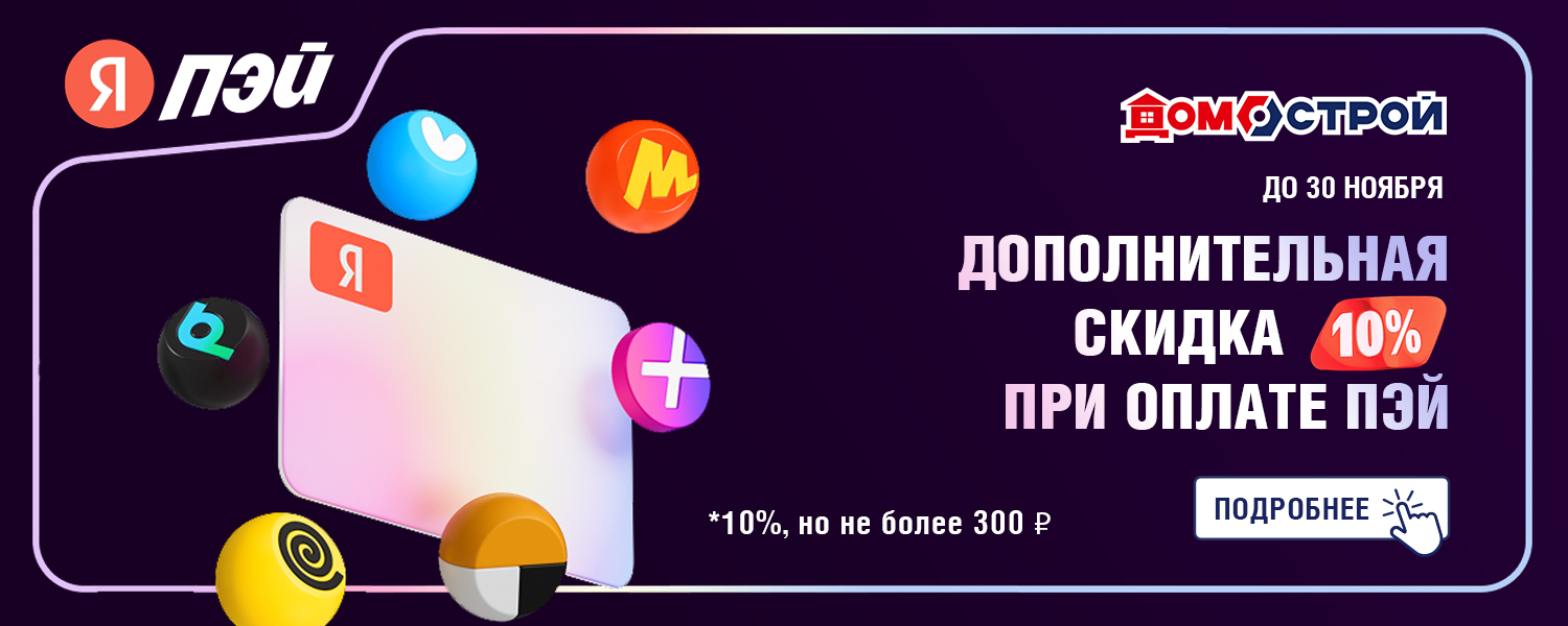 До 9 ноября оплачивайте заказы на сайте ДомоСтрой через Пэй и получайте скидку 10%. Яндекс Пэй — это оплата привязанной банковской картой через платёжный сервис от Яндекс.